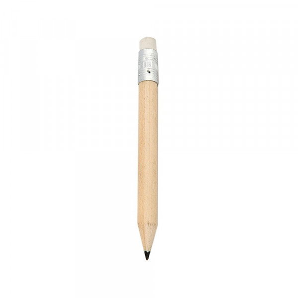 Mini houten potlood met natuurlijke afwerking.Met ronde loop en witte rubber kleur. Zwarte stift en geslepen punt.