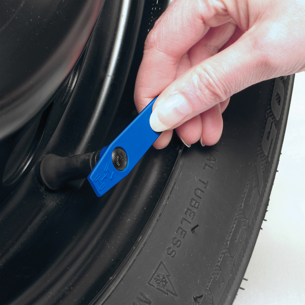 met bandenprofieldieptemeter en ventieldopschroevendraaier. UITLOPEND ARTIKELmeer
