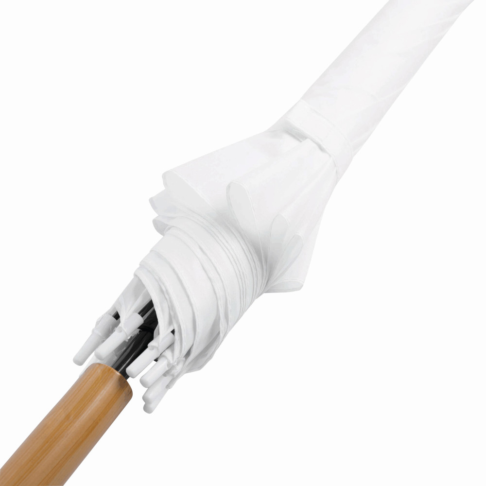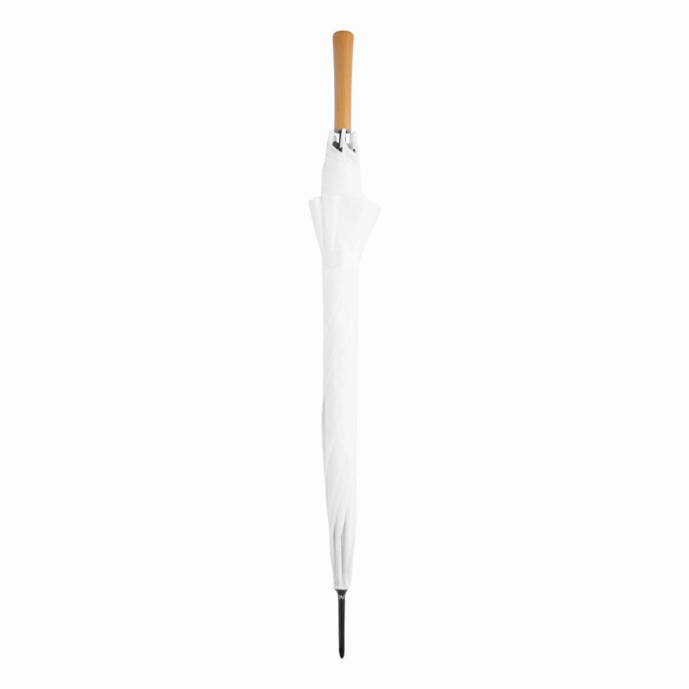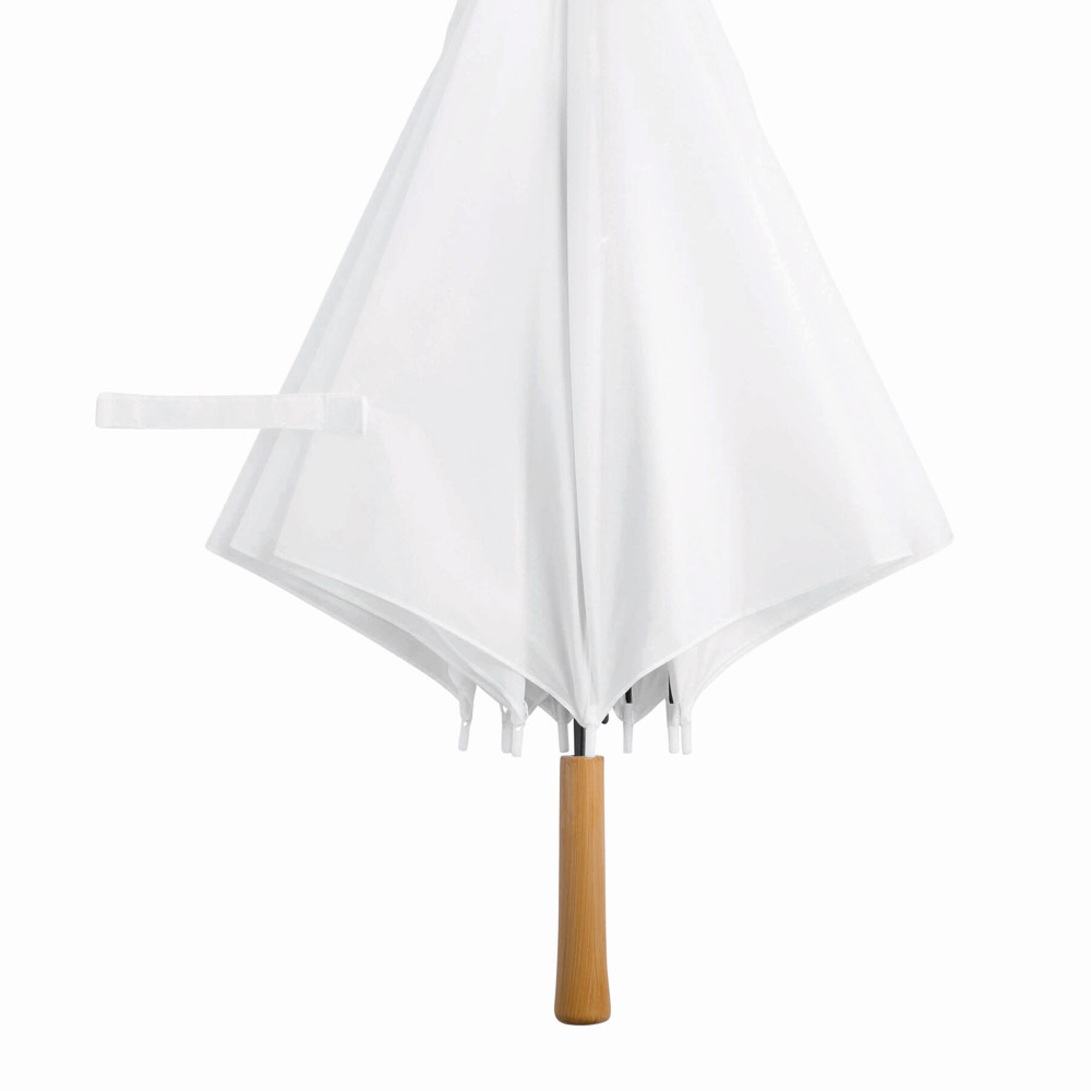 Automatisch te openen paraplu LIMBO: metalen steel en baleinen, matching kleurige kunststof tips, handvat in hout-look, polyester doek, sluitband met klittenband.