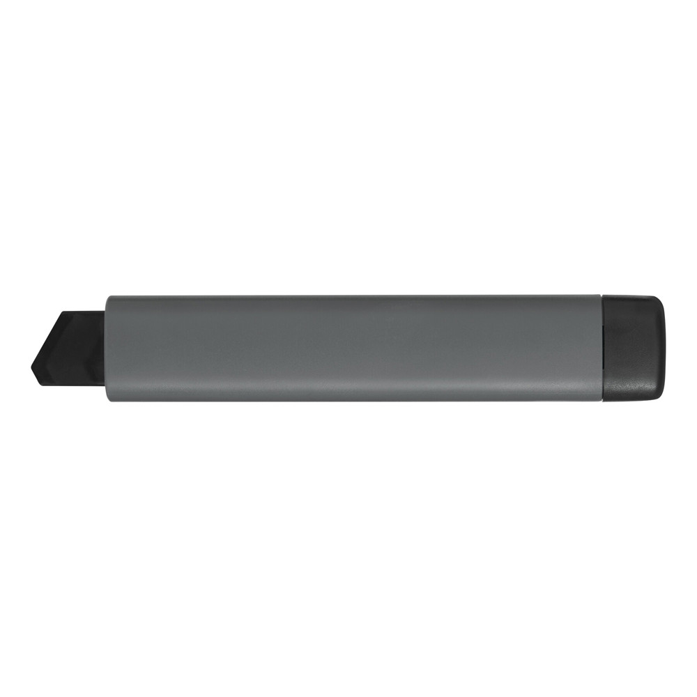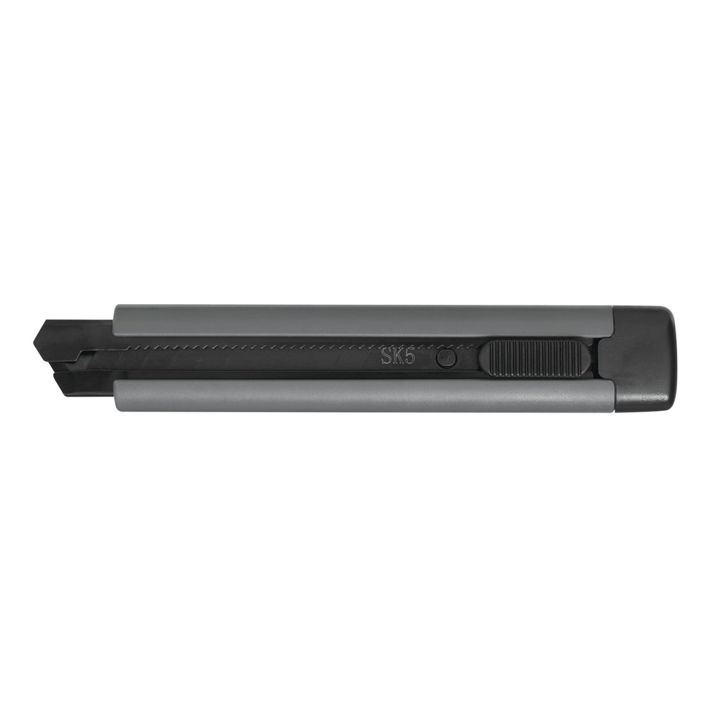Afbreekmes RELIABLE: met beweegbaar, zwart afbreekmes van 18 mm (10 snijsegmenten en 2 reservemessen), mechanisme met schuifknop en automatische stop, kunststof behuizing, mesgeleiding van staal, voor lichte tot zware snijklussen, verpakt in een doos.