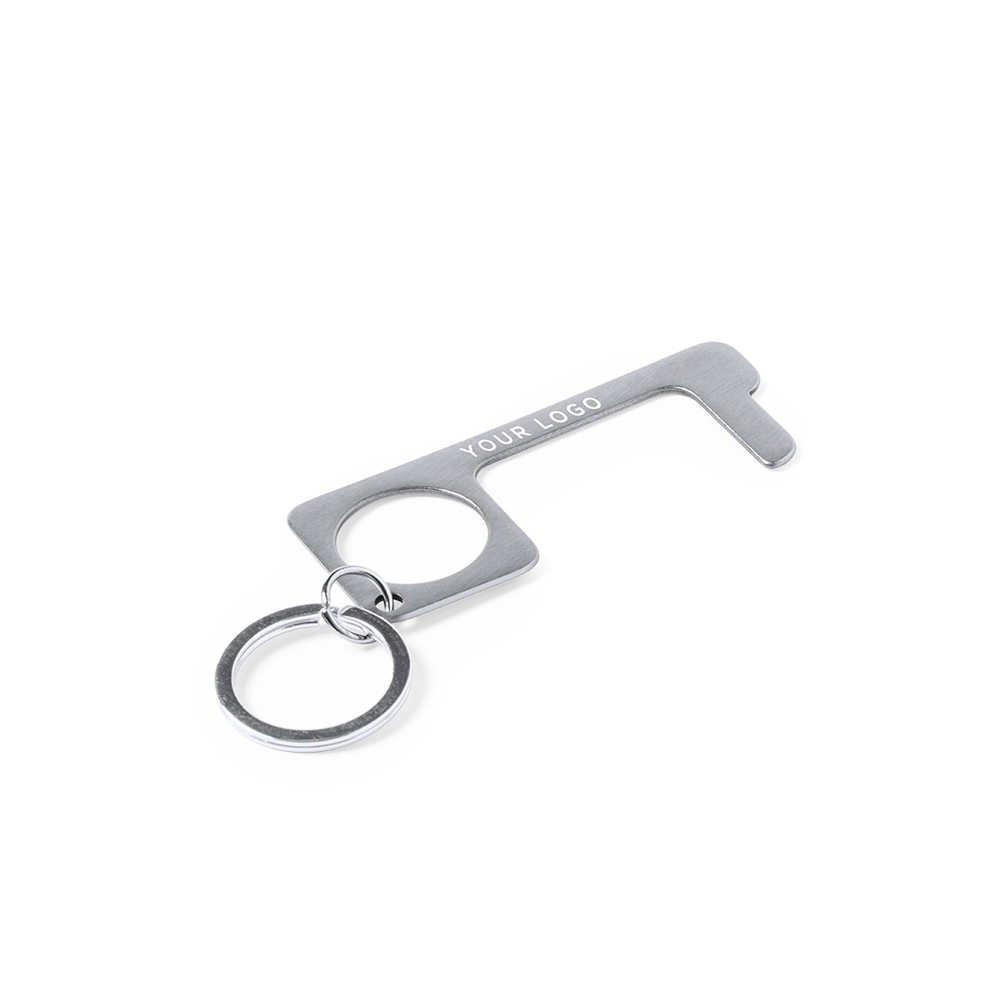 Hygiënisch, anti-contact veiligheids sleutelhanger, gemaakt van resistent roestvrij staal. Speciaal ontworpen om te voorkomen dat u het openbare gebruiksoppervlak met uw handen aanraakt (deurgrepen, schakelaars, openbare gebruikskranen, geldautomaten...). Met comfortabele uitsnede voor de vinger en gepresenteerd in een individuele tas. Aanbevolen voor laserprinten.