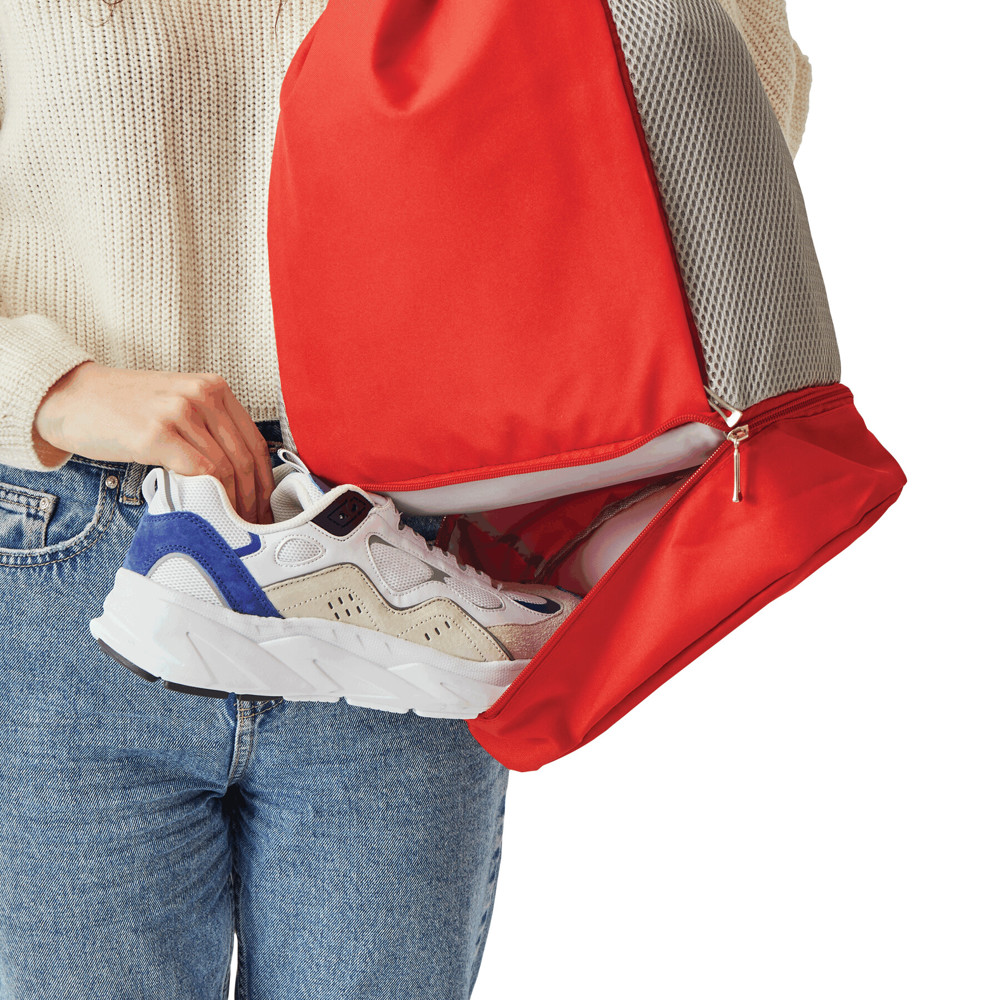 Rugtas TRIP: met band voor sluiting tevens geschikt als schouderbanden (verstelbaar), 1 groot hoofdvak, 1 binnenvak met ritssluiting en 2 steekvakken, 2 verticale voorvakken met ritssluiting, 1 compartiment met ritssluiting aan de onderzijde.