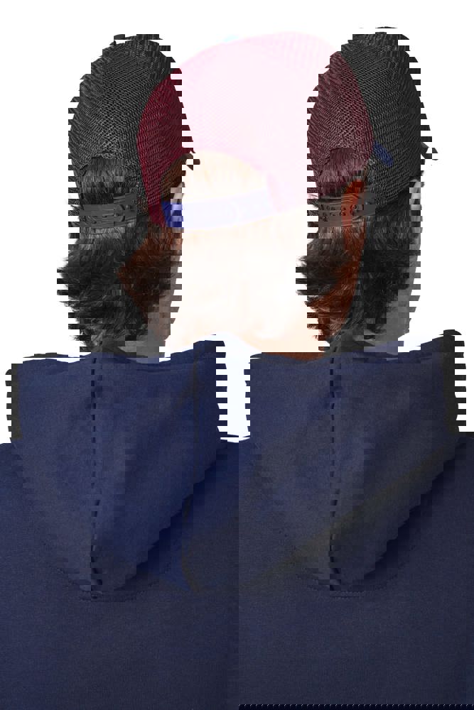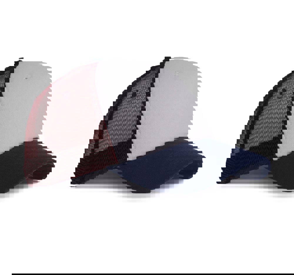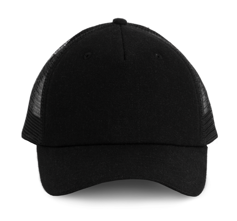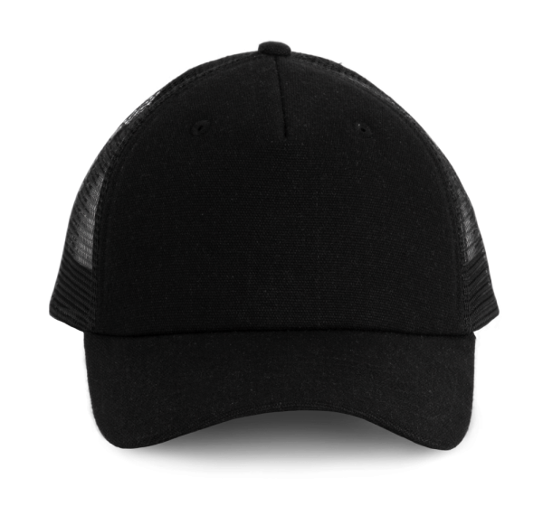 98% katoen / 2% polyester. Truckerpet met 5 panelen. Voorste panelen en zonneklep van canvaskatoen en mesh van polyester. Verstelbare druksluiting van plastic.