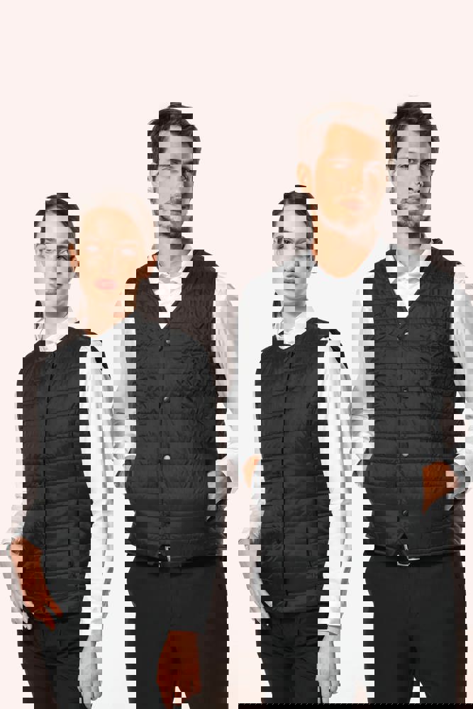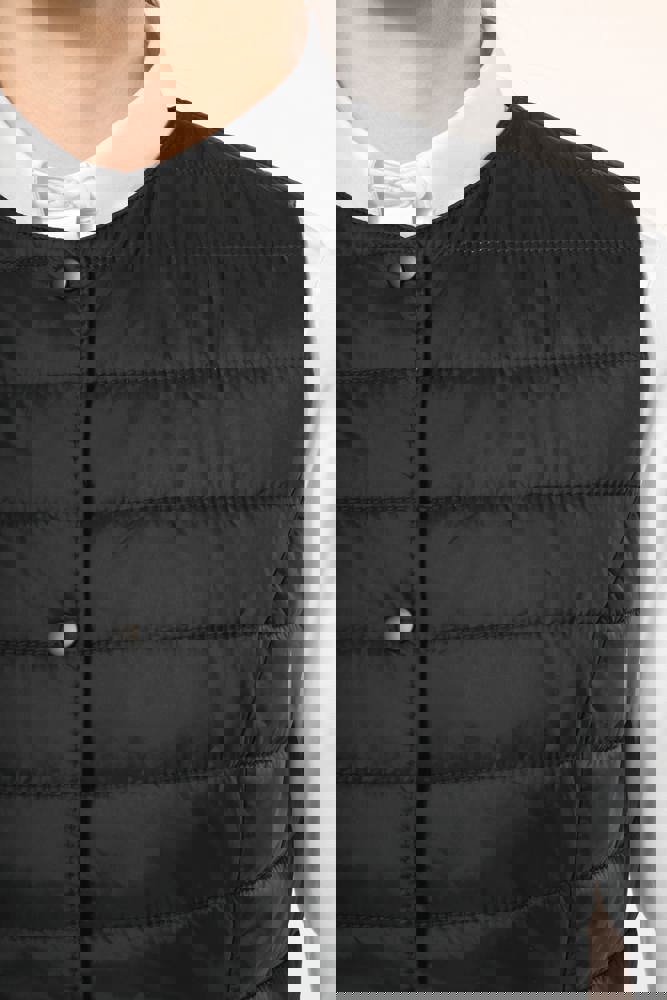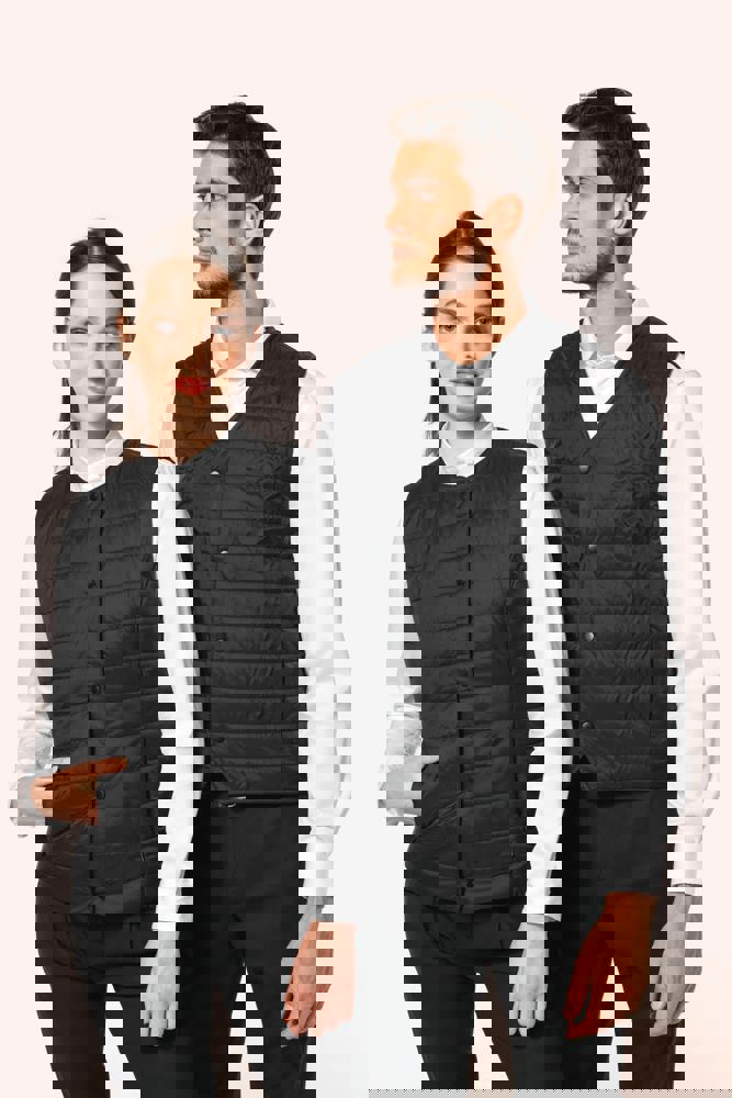 100% polyamide. Rechte snit. Gevuld met Thinsulate™. Inzetsel met 2 zijzakken en een verborgen rits. Sluit met ton-sur-ton drukknopen. Drukkersrits aan de binnenzijde links. Licht mouwloos gilet om het onder een jasje te kunnen dragen. Geen merklabel, maar enkel een maatlabel voor eenvoudige personalisatie.