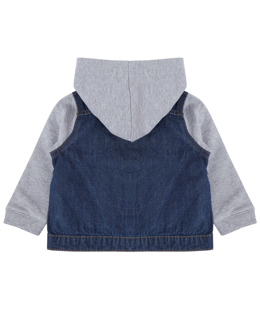 Denim: 100% katoen. Capuchon en mouwen: 71% katoen / 23% polyester. Jeansjasje met capuchon en mouwen in sweaterstof. Sluit met YKK-drukknopen. Twee zakken met klep aan de voorkant.