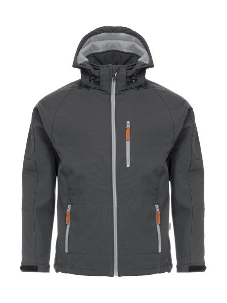 Softshell jas met contrasterende microfleece aan de binnenzijde. Wind- en waterbestendig (WP3000/MVP2000), afritsbare capuchon en manchetten verstelbaar met velcro. Elastisch trekkoord met stopper aan de capuchon en onderaan de zoom. Eén borstzak, twee zijzakken en één binnenzak.