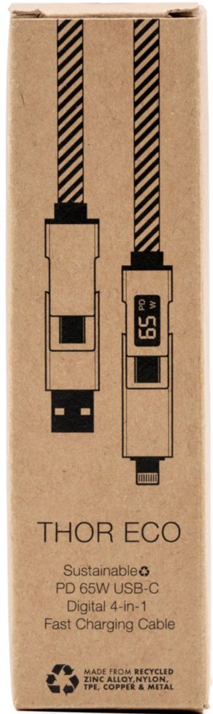 De BrandCharger Thor Eco 4-in-1 kabel biedt snelle en hoogwaardige oplaadprestaties met een duurzaam karakter. Gemaakt van stevig gerecycled nylon en 120?cm lang, ondersteunt deze kabel meerdere aansluitingen: input via USB-C en USB-A, en output naar USB-C en Lightning. Ontworpen voor efficiëntie, levert de kabel tot 65?W bij USB-C naar USB-C, 27?W bij USB-C naar Lightning, 27?W bij USB-A naar USB-C en 12?W bij USB-A naar Lightning. Ondersteunt USB 2.0 gegevensoverdracht. De Thor Eco combineert milieuvriendelijke materialen, veelzijdigheid en krachtige prestaties in één essentiële oplaadoplossing.