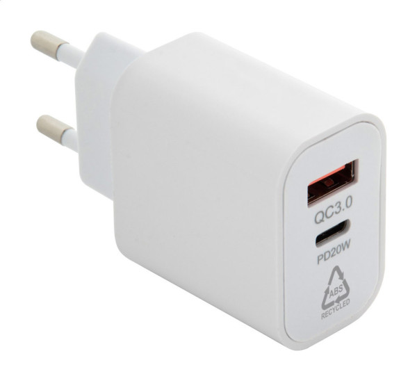 Gerecycled ABS snellaad USB-wandlader met 1 USB- en 1 USB-C-poort. Ondersteunt snellaadtechnologie (PD20W / QC3.0). Met 2-polige Europese stekker.