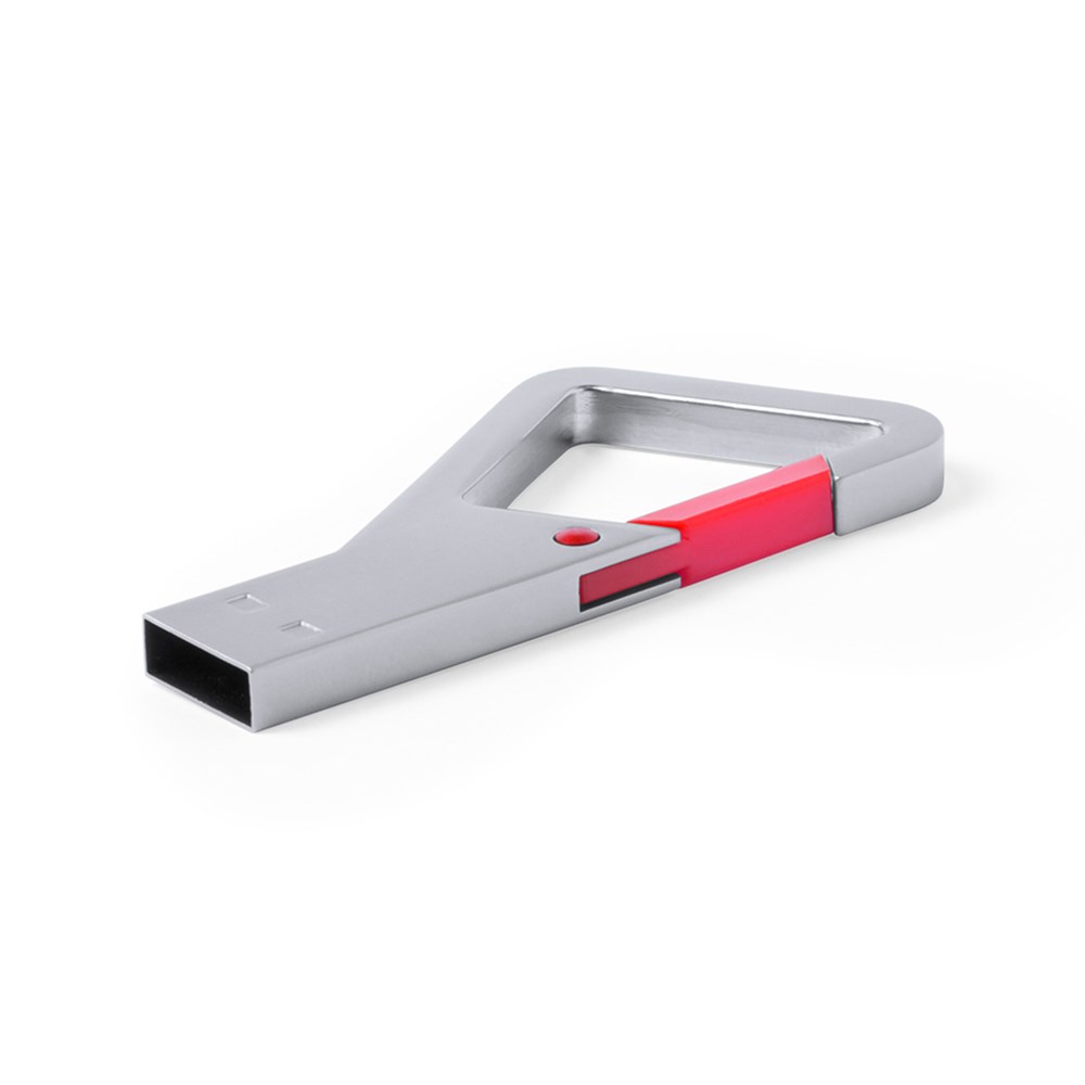 8 GB USB-stick van metaal, met origineel ontwerp met karabijnhaaksluiting, in verschillende kleuren. Gepresenteerd in een individuele metalen behuizing met venster en binnen zacht schuim.